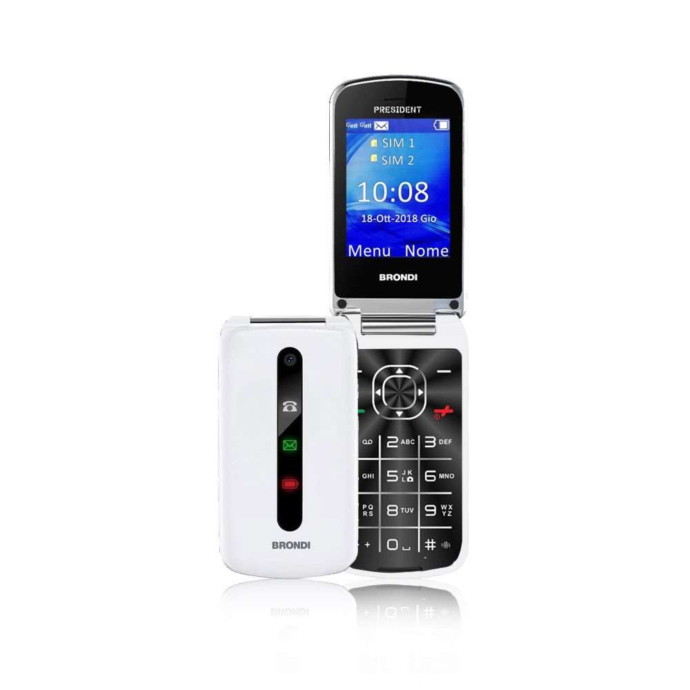 Il Brondi PRESIDENT è un telefono cellulare GSM Dual SIM Ultra Sottile con FLIP attivo e fornito di Maxi Display da 3 pollici full color per favorire una maggiore facilità di visualizzazione e utilizzo grazie ai caratteri grandi. Tra le caratteristiche principali del telefono Brondi President non possiamo fare a meno di evidenziare: la comoda apertura a conchiglia, la possibilità di rispondere e terminare la chiamata aprendo e chiudendo cellulare, la Fotocamera da 1.3 Mp e la Vibrazione. Gli auricolari sono inclusi e utili per differenti utilizzi come ascoltare la tua musica e la Radio FM, ma anche solo per una semplice comodità.