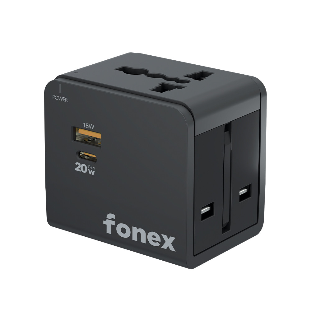 Fonex adattatore universale da viaggio 20W GaN compatibile con prese USA, AU, EU, UK | Con porta Type-C e USB | Nero