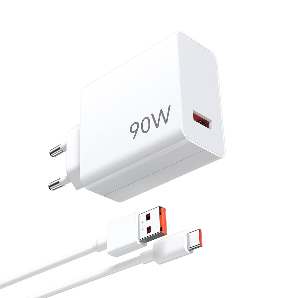 Caricatore da rete 90W, compatibile USB-C Power Delivery e Xiaomi HyperCharge; incluso cavo USB-C 6A; idoneo per smartphone e notebook compatibili; colore bianco.